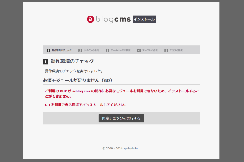 ご利用の PHP が a-blog cms の動作に必要なモジュールを利用できないため、インストールすることができません。