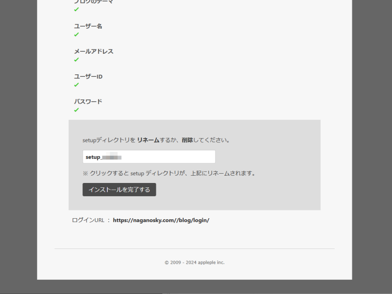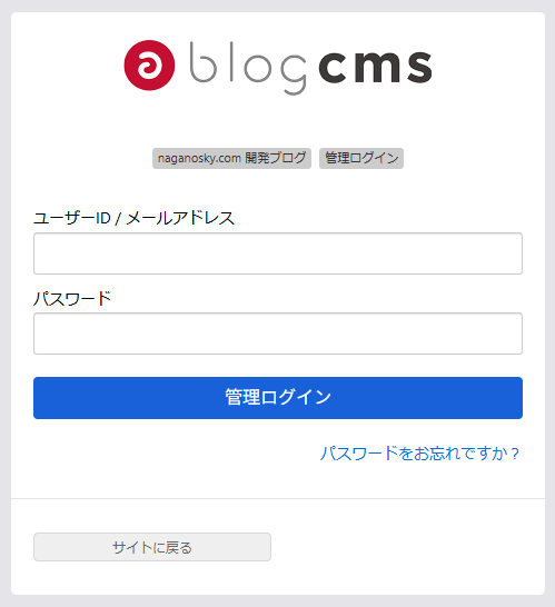 「インストールを完了する」をクリックすると、ログインURL(https://<ドメイン名>/blog/login/)に自動遷移する。